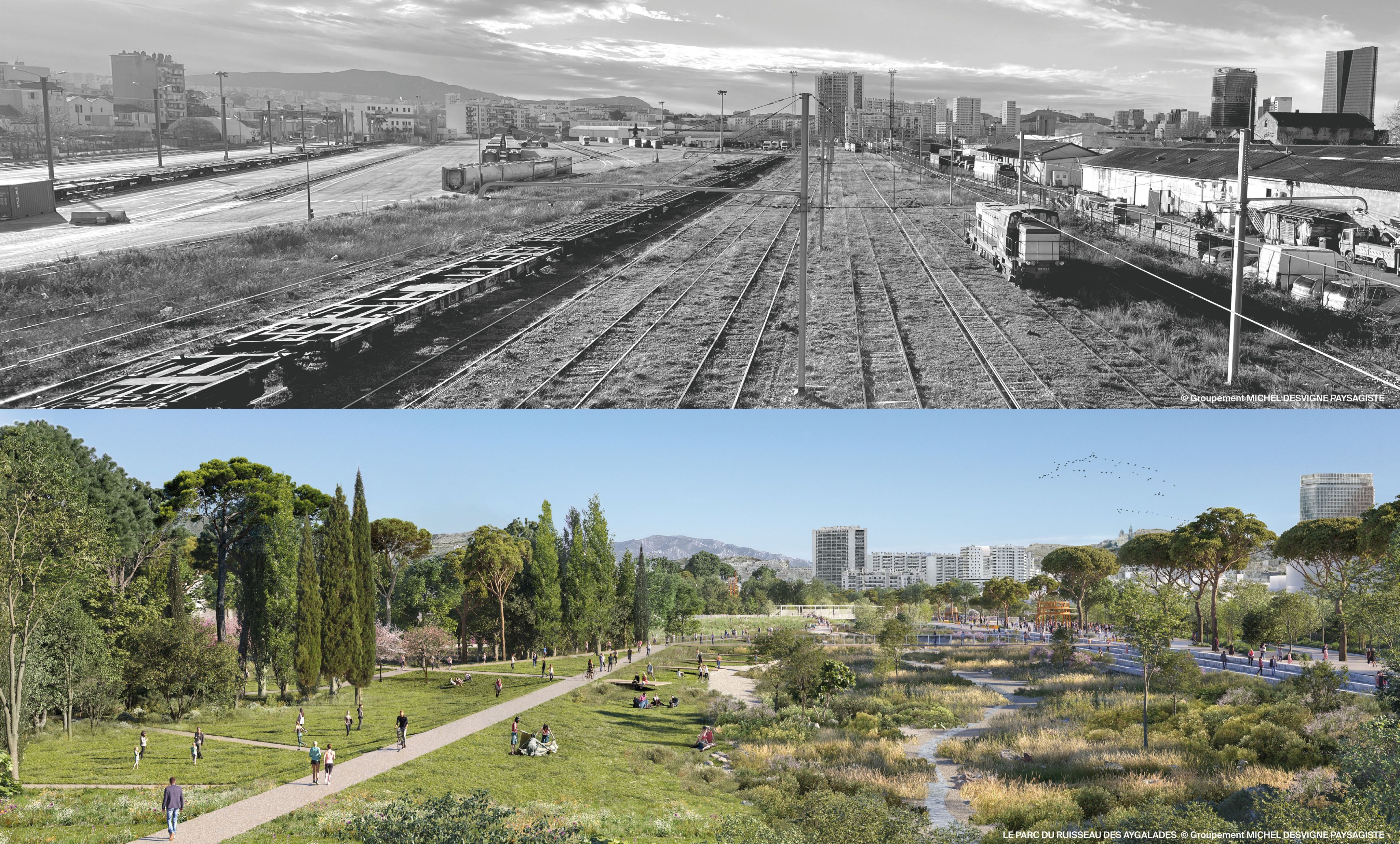 "Conserver ce quai permet de garder une trace de l'ancienne gare, c'est aussi la mémoire du lieu", souligne Michel Desvigne. Installé entre les boulevards Capitaine-Gèze et François-de-Lesseps, le parc du ruisseau des Aygalades sera accessible par huit entrées. Une passerelle réservée aux piétons et aux cyclistes le traversera d'est en ouest, reliant directement les Crottes au Canet. Au-delà de sa fonction récréative, cet aménagement recréera des liens entre les quartiers et ouvrira une perspective vers le port. Desservi par deux stations de métro et doté de parkings à proximité, il devrait attirer les riverains, comme les Marseillais venus de quartiers plus éloignés. Entre juin et novembre dernier, la concertation publique a permis de recueillir les attentes des habitants en matière d'activités, de convivialité, de détente… Les travaux démarreront en 2027.